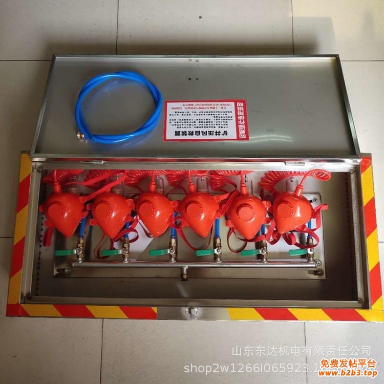 主要ZYJ-M型矿井压风自救装置是一种新型的隔绝式气体呼吸防护装置,本装置一箱六组(可根据要求设计组别),能同时提供六人使用,达到互相照顾的效果。ZYJ-M型矿井压风自救装置由箱体、安板、进气管、门锁、呼吸器(多组)等组成。箱体、安装板、进气管采用不锈钢制造而成。呼吸器安装于箱体内,呼吸器由调节阀、减压过滤阀、弹簧软管、自吸过滤式口罩等组成。减压过滤阀过滤空气中的杂质、水和油质、降低压风噪音,能精确调整控制供气压力,使工人呼吸无阻碍、畅通舒适。ZYJ-M型矿井压风自救装置采用自吸过滤式口罩直接带在嘴上进行呼吸,且通过弹簧软管连接,不影响使用人员视线,弹簧软管可自由伸缩,使用人员能在弹簧软管可伸缩范围内自由活动。ZYJ-M型矿井压风自救装置供气一般采用矿井压风管路。