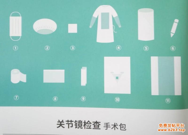 手术包配置:一次性使用医用口罩1个、一次性使用帽1个、擦手巾(40*40cm)4块、一次性使用手术衣(加强型)2件、集液袋1个、弹性绷带1卷、脚套1双、医用记号笔1支、备胶料(10*50cm)2条、关节镜检查单1条、一次性使用包布1条。